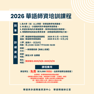 2026 華語師資培訓課程開放報名!靜宜學生免費參加!(名額有限)